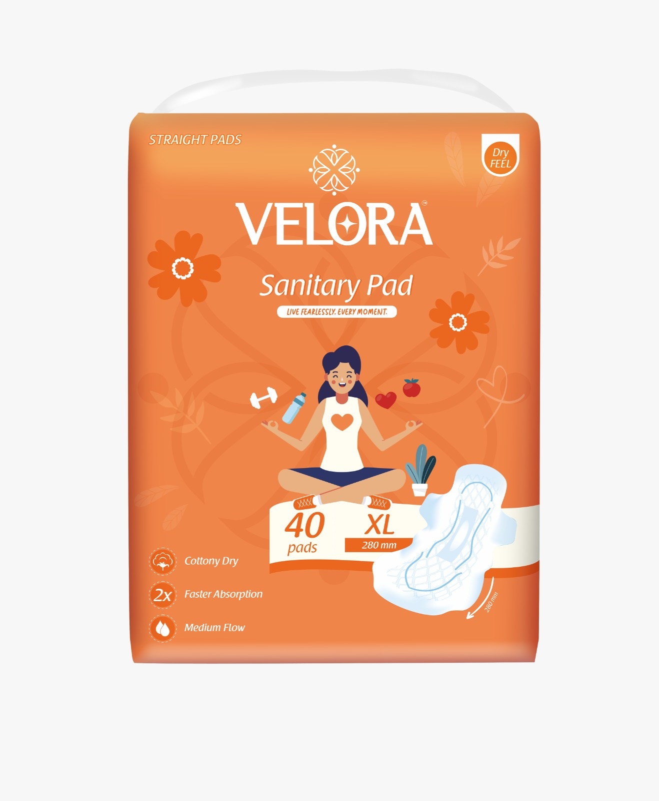 Velora XL 280mm Sanitary Pads – Pack of 40 Comfort Meets Confidence. Every Day of the Month. Experience all-day freshness and complete protection with Velora XL Sanitary Napkins. Designed with a 280mm length, these extra-large pads are ideal for medium to heavy flow days, offering maximum coverage and peace of mind. 🌿 Key Features: XL 280mm Length – Perfect for long-lasting protection and overnight use. Soft Cottony Top Sheet – Gentle on skin, reduces rashes and irritation. Quick Absorption Core – Instantly locks away moisture and odour. Wings for Extra Security – Prevents shifting and side leakage. Breathable & Antibacterial Layers – Helps maintain hygiene and freshness all day. Whether you're at work, traveling, or relaxing at home, Velora pads keep you dry, protected, and comfortable — always.